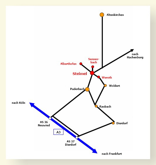 Die Bahnanreise ist möglich zu den Bahnhöfen Altenkirchen (11 km) und Neuwied (30 km). Busverbindungen nach Steimel bestehen nur sehr eingeschränkt.