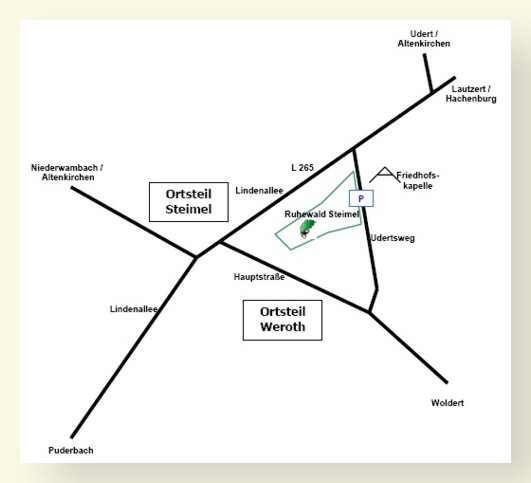 Nehmen Sie die Ausfahrt Neuwied (AS 36) oder Dierdorf (AS 37) und folgen dann der Beschilderung nach Puderbach. Durchfahren Sie Puderbach, bis Sie die Bahnschienen überqueren, und nach einer kleinen Steigung die vor Ihnen liegende versetzte Kreuzung - Steimel ist dort bereits ausgeschildert. Nach einer längeren Steigung und einige Kurven erreichen Sie Steimel. Bleiben Sie auf der "Linden- allee" und fahren Sie auf der L265 weiter in Rich- tung Lautzert, dabei fahren Sie an der Kreuzung vor dem Ortsende links an der Pizzeria vorbei. Nach ca. 500 m zweigt die entsprechend beschilderte Straße ("Friedhof / Ruhewald Steimel") rechts ab in den Udertsweg. Nach 100 m erreichen Sie den Ruhewald-Parkplatz.